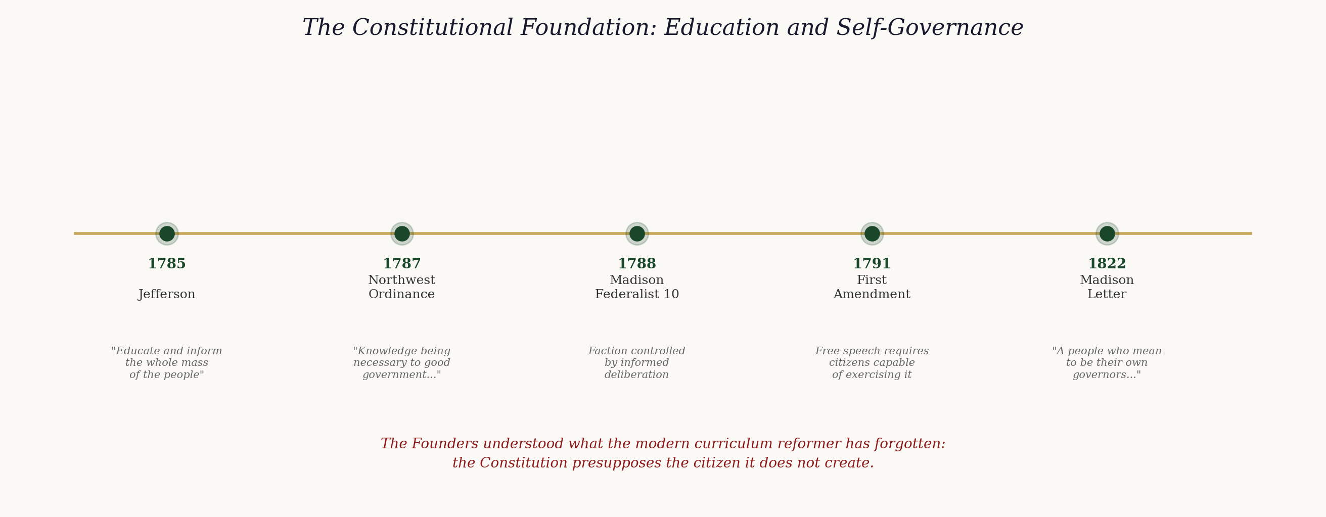 The Founders were not sentimentalists about education. They were structural thinkers who understood that institutions depend on the capacities of the people who inhabit them, and that those capacities do not arise spontaneously. Madison's republic requires Madison's citizen — a citizen equipped with cultural literacy, historical knowledge, rhetorical competence, and the ability to engage with complex argument about the public good. The Western canonical tradition is not the only means of producing such a citizen, but it is the tradition from which the constitutional order itself emerged, and its wholesale displacement from public education — without democratic mandate, without evidence of superior civic outcomes, and without acknowledgement of the constitutional stakes — is an act of extraordinary recklessness.